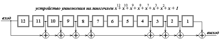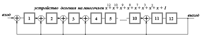 рисунок 14 Такой код полностью удовлетворяет требованиям помехоустойчивости, т.к. при допустимой вероятности ошибки 10 -5 , обеспечивает вероятность необнаружения ошибки 3.41*10 -6 (при вероятности ошибки в канале 10 -2 ). Формирователем циклического кода может выступать устройство умножения на порождающим многочлен g(x) = x 12 +x 10 +x 9 +x 8 +x 7 +x 3 +x 2 +x+1. Такое устройство, реализуемое на триггерах и двоичных сумматорах, приведено на рисунке 15.