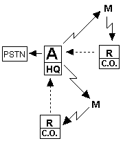 Диаграмма выше показывает центральный передатчик обслуживающий мобильные телефоны на большой территории. Одна антенна обслуживает широкую область, например службу радио такси. Поскольку установленный на автомобиле передатчик не был таким же мощным, как и центральная антенна, то его ответный сигнал не всегда мог быть получен. Это означало, другими словами, что Вам требовались принимающие антенны распределенные на большой территории, чтобы перенаправлять радио поток обратно на узел, обрабатывающий вызов. Этот процесс сохранения линии связи, переходящей от одной зоны к другой был назван handoff.
