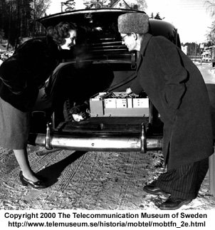 Давайте отправимся в Швецию, чтобы прочитать о типичном радиотелефонном устройстве, похожем на Американские установки: "Это было в середине 1950-х, когда первые оснащенные телефоном автомобили вышли на дорогу. Это было в Стокгольме - здание штаб-квартиры корпорации Ericsson - и первые пользователи были доктором на вызове и банки на колесах. Прибор состоял из преемника, передатчика и логического устройства, установленных в багажник автомобиля, с номеронабирателем и телефонной трубкой зафиксированными на щитке, висящем над обратной стороне переднего сиденья. Это было похоже на разъезды с полной телефонной станцией в автомобиле. Со всеми функциями обычного телефона, телефон питался автомобильной батареей. Ходит слух, что оборудование поглощало так много энергии, что Вы могли сделать только два вызова - Второй, чтобы попросить, чтобы гараж послал грузовик, чтобы отбуксировать прочь Вас, ваш автомобиль и вашу пустую батарею... Эти первые автотелефоны были просто слишком тяжелы и громоздкими - и слишком дороги в использовании - т.е. доступными для горстки клиентов. До середины 1960-х новое оборудование, использующее транзисторы не привозилось на рынок. Весящие много менее и потребляющие ничтожную часть энергии, мобильные телефоны теперь оставляли много места в багажнике - но Вам все еще потребовался бы автомобиль, чтобы передвигаться с ним".