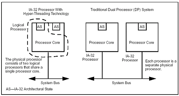 К обыкновенному однопроцессорному процессору добавили еще один блок AS — IA-32 Architectural State. В общем-то его назначение заключается в том, что он содержит состояние регистров (общего назначения, управляющих, APIC, служебных). Фактически, AS#1 плюс единственное физическое ядро (блоки предсказания ветвлений, ALU, FPU, SIMD-блоки и пр.) представляет из себя один логический процессор (LP1), а AS#2 плюс все то же физическое ядро — второй логический процессор (LP2). У каждого LP есть свой собственный контроллер прерываний (APIC — Advanced Programmable Interrupt Controller) и набор регистров. Для корректного использования регистров двумя LP существует специальная таблица — RAT (Register Alias Table), согласно данным в которой можно установить соответствие между регистрами общего назначения физического CPU. RAT у каждого LP своя. В результате получается схема, при которой на одном и том же ядре могут свободно выполняться два независимых фрагмента кода т. е. де-факто — многопроцессорную систему!