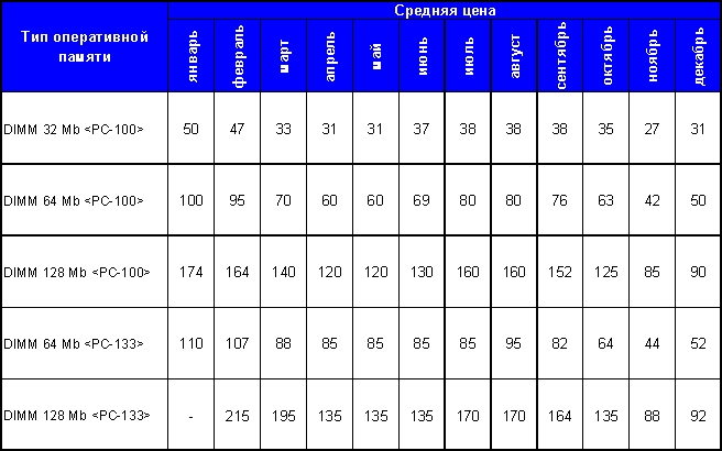 Исследование проводилось в городе Владивостоке. В качестве объектов исследования были выбраны модули оперативной памяти, имеющиеся в свободной продаже на рынке. Было определено пять основных типов RAM микросхем (SDRAM DIMM 32 MB <PC-100>, SDRAM DIMM 64 MB <PC-100>, SDRAM DIMM 128 MB <PC-100>, SDRAM DIMM 64 MB <PC-133>, SDRAM DIMM 128 MB <PC-133>) , которые на данный момент в набольшей степени соответствовали запросам среднего покупателя (пользователя) По этой причине не брались модули SIMM и более старые чипы (которые уже не производятся и не имеют спроса) , а также самые новые разработки – RDRAM, Direct RamBus, так как они поступают на наш рынок в ограниченных количествах, имеют незначительный спрос и потому не дают объективной картины в целом. За основу исследования были взяты прайс-листы компьютерных компаний города (названия в разделе Список использованной литературы) . На основе этих данных была составлена следующая таблица. По таблице были построены графики изменения цен по каждому из модулей.