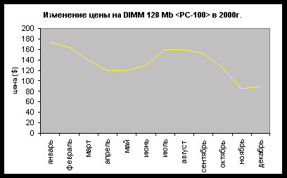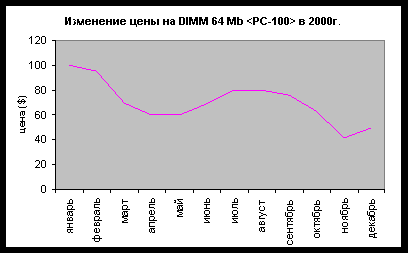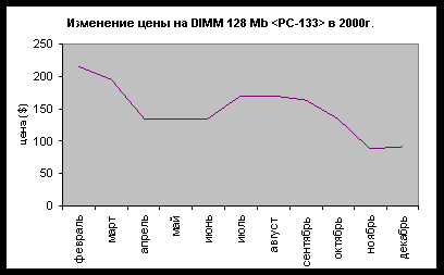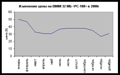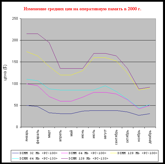 Для получения более ясной картины нужно сравнить их между собой: построим общий график для всех модулей. Заметим, что все графики примерно одинаково возрастают и убывают. Это доказывает правильность моего исследования: цена на оперативную память, как и на любой другой товар, не постоянна и подвержена колебаниям вследствие множества причин. Сразу надо оговориться, что цены на RAM микросхемы имеет тенденцию к снижению. Связано это в первую очередь с общим развитием компьютерных технологий, появляются новые разработки, а цены на старые падают. Падение цен на модули оперативной памяти, начавшееся в середине 1999г. продолжилось и в первые месяцы 2000г (кривые на графике убывают с января по апрель) . Затем наступает стабилизация (апрель – май) . Это связано с предстоящим традиционным летним подорожанием (июнь – август) . После цены опять начинают планомерно снижаться в свете общего понижения стоимости компьютерных комплектующих (август – ноябрь) , цены падают низко как никогда (до $21 за DIMM 32 MB) . Затем опять идет скачок верх (ноябрь – декабрь) , и в перспективе цены, на мой взгляд, будут продолжать расти. Относительно спроса на оперативную память можно сказать, что он зависит от цены в данный момент, но не полной степени определяется им. Можно утверждать, что потенциальные покупатели готовы к изменению цены в ту или другую сторону и рассчитывают свои будущие покупки исходя из этого. Мои окончательные выводы таковы: рынок оперативной памяти подвержен таким же экономическим процессам, как и рынок любого другого товара. Цена на микросхемы склона к понижению, но постоянно колеблется, что связано как с экономическими (повышение налогов, например) , так и с не экономическими (сезонность товара, ожидания потребителей) причинами.