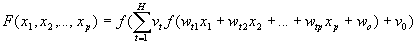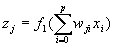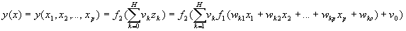 f 1 (x) – функция активации нейронов скрытого слоя; f 2 (x) – функция активации нейрона выходного слоя. В качестве функции активации f 1 (x) для нейронов скрытого слоя и f 2 (x) для единственного нейрона на выходе сети предлагается использовать одну и ту же функцию, а именно сигмоидную функцию активации, для краткости будем обозначать ее как f(x) :