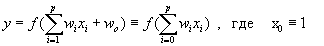 w i — вес синапса (weight) , ( i=0,1,2... p ) ; w 0 — значение смещения (bias) ; s — результат суммирования (sum) ; x i — компонента входного вектора (входной сигнал) , ( i=1,2,... p ) ; y — выходной сигнал нейрона; p- число входов нейрона; f — нелинейное преобразование (функция активации) . В общем случае входной сигнал, весовые коэффициенты и значения смещения могут принимать действительные значения. Выход ( y ) определяется видом функции активации и может быть как действительным, так и целым. Во многих практических задачах входы, веса и смещения могут принимать лишь некоторые фиксированные значения. Синаптические связи с положительными весами называют возбуждающими, с отрицательными весами — тормозящими. Таким образом, нейрон полностью описывается своими весами w i и передаточной функцией f(x) . Получив набор чисел (вектор) x k в качестве входов, нейрон выдает некоторое число y на выходе.