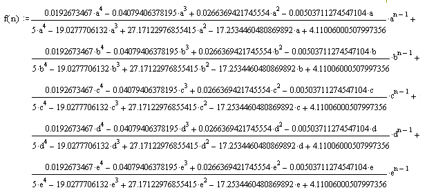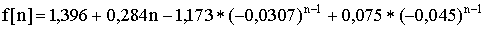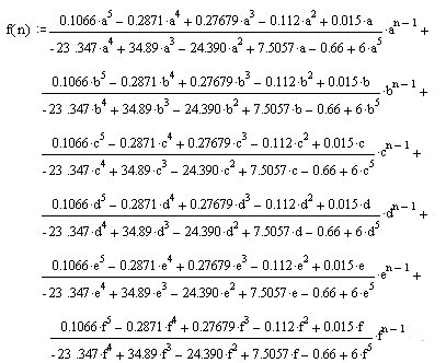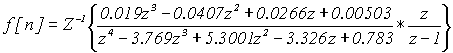 Полюса функции: z 1 = 1; z 2 = 0.847; z 3 = 0.965; z 4 = 0.973 — j0.0113; z 5 = 0.973 + j0.0113. Производная знаменателя функции: B ’ (z) = 5z 4 -19.027z 3 +27.171 z 2 -17.253z+4.110 Подставим значение полюсов функции и значение производной в формулу (4.13) , получим выражение для f[n]: где а = z 1 ; b = z 2 ; c = z 3 ; d = z 4 ; e = z 5 ;