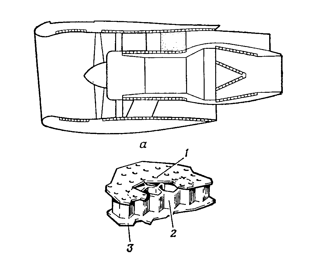 а – мотогондола с ЗПК; б – многослойная звукопоглощающая конструкция; 1 – перфорированная обечайка; 2 – сотовый заполнитель; 3 – опорная поверхность. Рис. 2