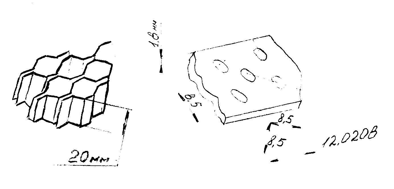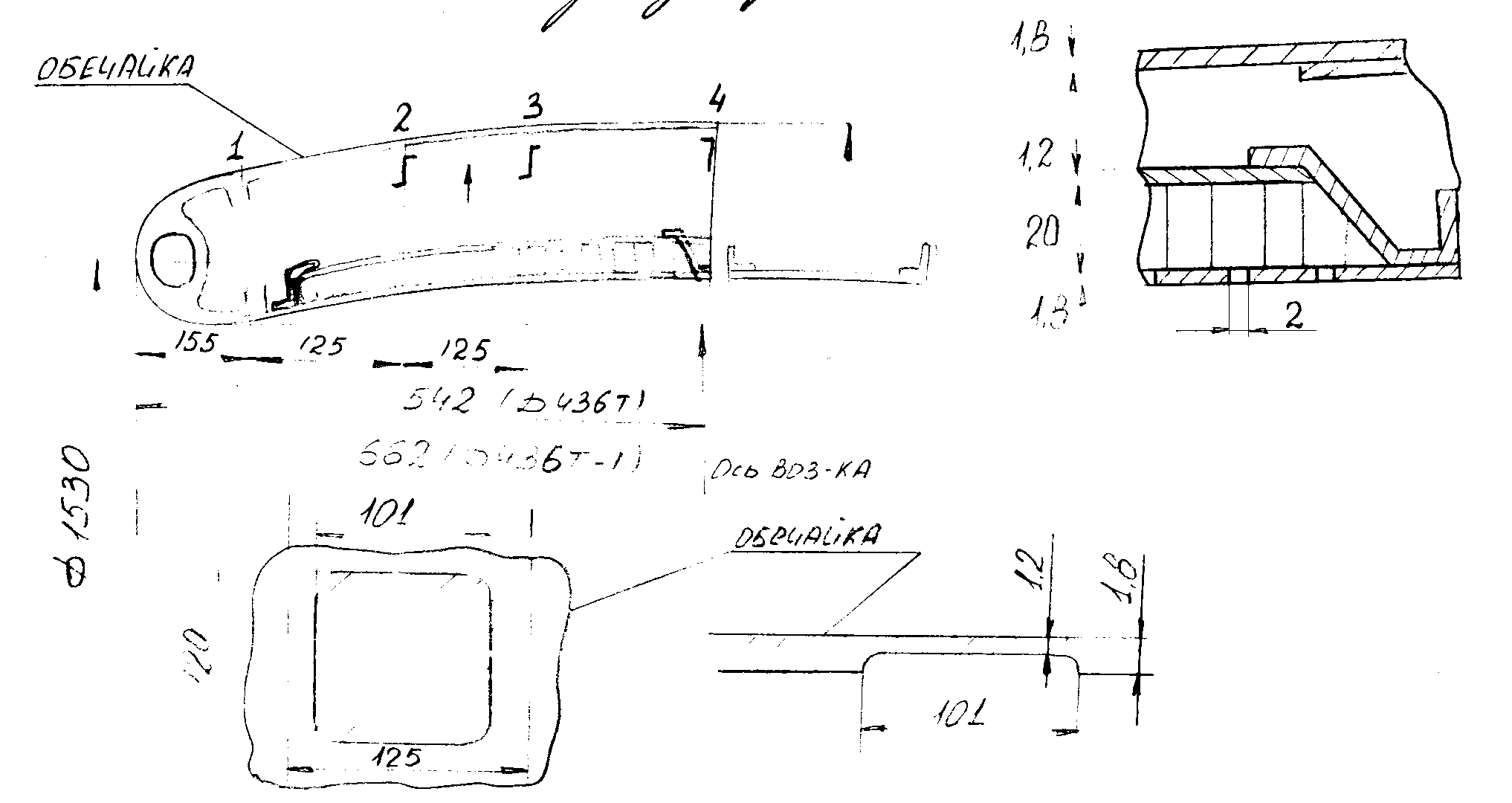 Рис. 21 Внешняя обшивка: D = 1,2 мм, материал: сплав Д19. Обечайка изготовлена из Д16Т, D = 1,8 мм, травленная с D = 1,8 мм до D = 1,2 мм. Максимальный размер клетки 101 на 120 мм. Характерные размеры и сечения представлены на рис. 22 Типовое сечение обечайки