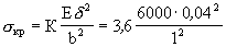 s см = (0,357·0,866) /(1·0,04) = 8,12 (кг/см 2 ) , h = 34,56/8,11 – 1 = 3,26 Проверяем стенку ячейки на устойчивость от номинального давления в канале при М = 0,52 (Н = 0, D pD = 1,009 кг/см 2 ) . Давление передаваемое на заполнитель: Р зап = Р/(1 + d + x) = 1,009/1,80536 = 0,559 (кг/см 2 ) . s см = (0,559·0,866) /(1·0,04) = 12,1 (кг/см 2 ) , h = 34,56/12,1 – 1 = 1,856. Определяем допустимый диаметр пятна непроклея по наружной обшивке. Рассмотрим работу квадратной пластинки на устойчивость (кромки оперты) . a/b = 1, K = 3,6.