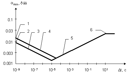 С 1 =5.6Ч 10 3 (D t) 0.25 ; T 1 =10 0.8(l -295) -15 ; C 2 =10 0.2(l -295) ; T 2 =10 1+0.02(l -550) ; C 3 =10 0.015(l -550) ; C 4 =10 (l -700) /500 ; С 6 =18(D t) 0.75 ; 1.1.4. МДУ облучения глаз рассеянным лазерным излучением На практике наиболее вероятно именно рассеянное лазерное облучение. В этом случае важно при определении МДУ облучения перенормировать плотность излучения в диапазоне 0.4<l <1.4 мкм, достигающего сетчатки и поражающего ее. Эта перенормировка связана с тем, что характер и размер поражения сетчатки изменяются в связи с резким увеличением зоны облучения — от 0.01 мм (определяется аберрацией глаза и дифракцией света на его зрачке) , то есть угловой размер составляет примерно 1', или 0.0003 рад, до a =0.015ё 0.24 рад. Последняя величина (эффективный угол зрения) во многом зависит от длительности облучения и (для коротких импульсов) от длины волны. Все это видно из рисунка 2, где представлена кусочно-линейная аппроксимация a =a (D t) в двойном логарифмическом масштабе.