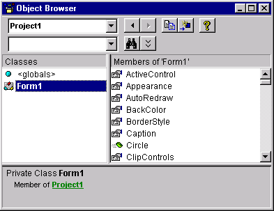 назад | содержание | вперед Окно просмотра объектов Для просмотра всех элементов, входящих в состав проекта. Visual Basic 6 предоставляет очень удобную возможность — окно просмотра объектов Object Browser (рис. 1.10). В этом окне можно получить доступ не только ко всем элементам, которые входят в проект, но и их свойствам, методам, событиям. Окно просмотра объектов обычно не визуализировано и его можно вызвать командой Object Browser (Браузер объектов) из меню View (Вид).