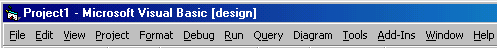 назад | содержание | вперед Главное меню Главное меню, как и во всех приложениях Microsoft, представляет собой линейку раскрывающихся меню. Оно содержит следующие основные команды: File (Файл), Edit (Правка), View (Вид), Project (Проект), Format (Формат), Debug (Отладка), Run (Запуск), Query (Запрос), Diagram (Диаграмма), Tools (Сервис), Add-Ins (Надстройки), Window (Окно), Help (Справка). Вид главного меню показан на рис. 1.3. Наиболее часто используемые команды меню отображены в виде кнопок со значками на стандартной панели инструментов, размещенной ниже меню. Многие команды окажутся знакомыми, поскольку главное меню Visual Basic 6 организовано и работает так же, как и в других приложениях Microsoft, — например, в текстовом редакторе Microsoft Word или в электронной таблице Microsoft Excel.
