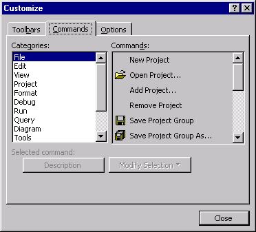 Рис. 1.4. Диалоговое окно Customize 3. Из списка Categories (Категории) выберите наименование категории, из которой хотите выбрать команду. 4. В списке Commands установите курсор на команду, помещаемую на панель инструментов. 5. Нажмите и, удерживая в нажатом состоянии правую кнопку мыши, перетащите выбранную команду на панель инструментов. 6. Завершив перемещение, отпустите кнопку мыши. 7. Повторяя пункты с 3-го по 6-й, перенесите на панель инструментов требуемые вам команды. 8. Нажмите кнопку Close (Закрыть) для закрытия диалогового окна. Используя диалоговое окно Customize, можно менять порядок расположения кнопок на панели инструментов. Для этого выполните следующие действия: 1. Откройте диалоговое окно Customize (Настройка) любым удобным для вас способом. 2. На вкладке Toolbars (Панели инструментов) установите флажок рядом с наименованием той панели инструментов, на которой хотите изменить порядок расположения кнопок. Если панель уже присутствует на экране, то флажок для нее установлен, и этот пункт не выполняется. 3. На выбранной панели инструментов нажмите кнопку, расположение которой хотите изменить, и, удерживая ее в нажатом состоянии, переместите в новое положение. При этом появляющийся маркер (указатель) позиции "¦" помогает точно перенести кнопку на требуемое место. 4. Аналогичным образом измените порядок требуемых кнопок. 5. Сформировав нужный порядок кнопок, нажмите Close (Закрыть) для закрытия диалогового окна Customize.