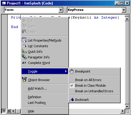Рис. 10.2. Редактор кода в режиме просмотра процедур Редактор кода вызывается автоматически при двойном щелчке мыши на форме проекта или командой Code (Код) меню View (Вид). Для каждого элемента проекта (формы или программного модуля) открывается отдельное окно редактора кода. Соответственно это окно появляется в списке окон меню Window (Окно). В большом проекте удобнее всего работать из Проводника проекта. В этом случае редактор кода вызывается кнопкой View Code (Просмотр кода) панели инструментов окна Проводника. Для работы в окне редактора можно использовать контекстное меню (рис. 10.3). Оно содержит команды, приведенные в табл. 10.1.