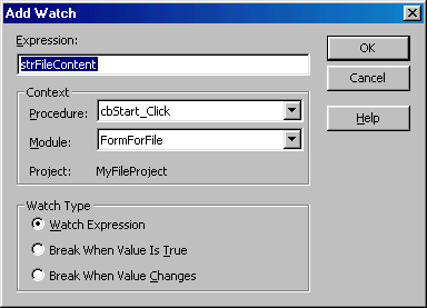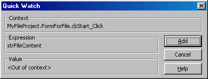 Рис. 10.10. Окно Add Watch для добавления контролируемого выражения Область Context диалогового окна Add Watch позволяет установить область видимости переменных, наблюдаемых в выражении. Раскрывающийся список Procedure (Процедура) задает видимость внутри процедур, а список Module (Модуль) — внутри программных модулей. Переключатель Watch Type (Тип просмотра) определяет, как Visual Basic реагирует на наблюдаемое выражение. При установке опции Watch Expression (Выражение наблюдения) значение выражения отображается в диалоговом окне Watches в режиме прерывания. Опция Break When Value Is True (Приостановить при равенстве выражения значению Истина) автоматически задает режим прерываний и обращение к контролю выражений при условии равенства выражения значению True или ненулевому значению для числовых выражений. Опция Break When Value Changes (Приостановить при из менении значения выражения) аналогична опции Break When Value Is True, но приложение входит в режим прерывания при изменении значения выражения. В дополнение к окну Watches, для просмотра выражений можно использовать окно Quick Watch (Быстрый просмотр) для быстрого доступа к значению выражения (рис. 10.11). Для этого окна не требуется вводить список контролируемых выражений, а достаточно выделить интересующее выражение в тексте кода и вызвать окно Quick Watch одноименной кнопкой на панели инструментов Debug, Для контроля выполняемых процедур используется окно Call Stack (Стек вызовов), в котором показаны все вызванные и активные в данный момент процедуры (рис. 10.12).