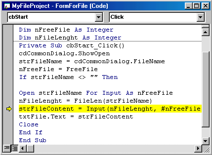 С остальными инструментами вы сможете познакомиться при рассмотрении процесса отладки. Откройте любое из ранее разработанных приложений, например приложение для изучения записи/чтения данных из файла. Установите точку останова в процедуре записи данных. Для этого щелкните кнопкой мыши, установив указатель в сером вертикальном поле редактора кода напротив интересующей строки, или выполните команду Toggle Break-point (Установить точку останова) меню Debug (Отладка). При этом в сером вертикальном поле рядом с выбранной командой устанавливается жирная точка (рис. 10.5), остановка выполнения программы произойдет именно в этом месте кода.