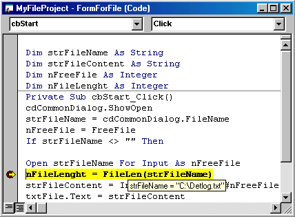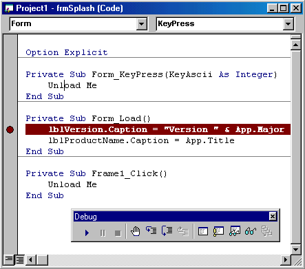 назад | содержание | вперед Отладка программ Как правило, отладка — это проверка работы и исправление ошибок программистом перед передачей проекта на тестирование. Инструментарии отладки позволяет проконтролировать избранные участки кода приложения для локализации ошибки, выполняя приложение по шагам, останавливаясь в точках останова, дает возможность проверить значения переменных, свойств объектов и другую интересующую информацию и выяснить, таким образом, источник ошибки. В набор инструментария отладки Visual Basic 6 входят такие основные инструменты, как: