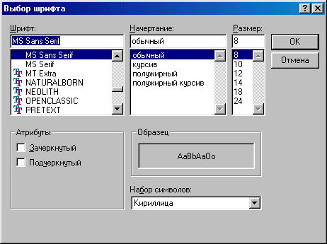 Для установки наименования шрифта используется список Шрифт диалогового окна. Чтобы установить начертание (полужирный, курсив, обычный), используется список Начертание. Размер шрифта можно установить в поле Размер вручную или выбрать значение из списка размеров. Для установки атрибутов зачеркнутый и подчеркнутый, необходимо использовать флажки Зачеркнутый и Подчеркнутый. Таблица кодировки набора символов назначается в раскрывающемся списке Набор символов.