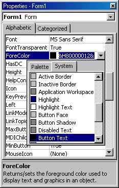 назад | содержание | вперед Управление цветом Управление цветом формы и элементов управления можно организовать, используя свойства ForeColor и BackColor. Свойство ForeCoior задает цвет текста, а BackColor устанавливает цвет фона. В режиме проектирования приложения эти свойства можно установить в окне Properties (Свойства) объекта (рис. 11.6), вызвав диалоговое окно настройки цвета. Для этого необходимо выделить настраиваемое свойство и нажать на кнопку со стрелкой в правом столбце свойства. Как видно из рисунка, это диалоговое окно состоит из двух вкладок: Palette (Палитра) и System (Системные). На вкладке Palette можно установить произвольные цвета из палитры, на вкладке System можно выбрать цвет из списка цветовой схемы Windows, которая устанавливается в панели управления Windows вызовом окна настройки Свойства: Display. При использовании цветовой схемы необходимо иметь в виду, что при изменении настройки цветовой схемы Windows соответственно изменятся и цвета приложения.