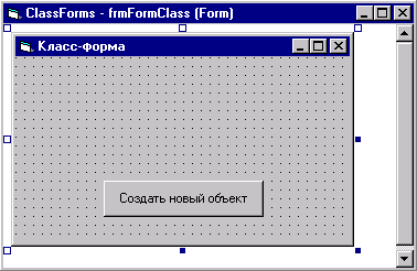 назад | содержание | вперед Создание класса формы Вначале займемся созданием класса формы. Выполните следующие действия: 1. Откройте новый проект типа Standard EXE. 2. Используя диалоговое окно свойств проекта, открываемое командой Projecti Properties меню Project, назовите проект classForms. 3. С помощью окна свойств Properties (Свойства), открываемого командой Properties Window меню View или командой Properties контекстного меню, переименуйте форму в frmFormcis. 4. Добавьте в форму элемент управления типа commandButtom, дважды щелкнув мышью кнопку CommandButtom на панели элементов управления. Можно не изменять имени кнопки, заданного по умолчанию. Используя свойство Caption, задайте название кнопки Создать новый объект. Выполненный проект показан на рис. 15.5.