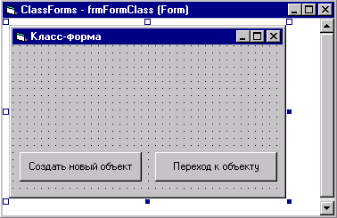 Рис. 15.5. Приложение для изучения класса форм 5. В окно редактора введите следующий код: Private Sub Commandl_Click() Dim FormNew As New frmFormCIs FormNew.Show End Sub 6. Запустите приложение на выполнение. При нажатии на размещенную в форме кнопку создаются объекты класса frmFormcis, то есть, проектируя форму, вы спроектировали целый класс форм. При многократном вызове объектов этого класса создается коллекция объектов, и каждая форма при этом является членом коллекции. Для идентификации конкретного члена используется индекс членов коллекции, при помощи которого можно сослаться на любую форму из коллекции или получить управление конкретной формой. Для форм в Visual Basic 6 существует специальная коллекция Forms, при помощи которой можно адресоваться к конкретной форме. Чтобы изучить данное свойство коллекции форм, усовершенствуйте приложение следующим образом: 1. Добавьте в приложение еще один элемент управления типа commandButton и задайте наименование созданной кнопки Переход к объекту. Имя кнопки можно оставить заданным по умолчанию (рис. 15.6).