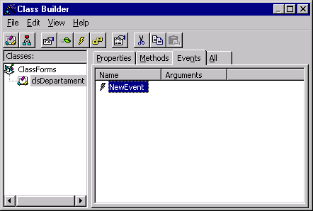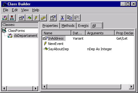 Рис. 15.15. Диалоговое окно построителя событий Event Builder При необходимости можно работать сразу со всеми членами класса с помощью вкладки All (Все) построителя классов (рис. 15.16). После завершения работы с классом его необходимо сохранить в файле с расширением els. Полный текст полученного при помощи Class Builder класса приводить нет необходимости, поскольку он достаточно объемный. Следует заметить, что свойства вводятся не как глобальные переменные, а с помощью функций Property Get и Property Let. Для примера можно привести текст свойства AddSalary: Private mvarAddSalary As Currency 'local copy Public Property Let AddSalary(ByVal vData As Currency) 'used when assigning a value to the property, on the left side of an assignment. 'Syntax: X.AddSalary = 5 mvarAddSalary = vData End Property Public Property Get AddSalary () As Currency 'used when retrieving value of a property, on the right side of an assignment. 'Syntax: Debug.Print X.AddSalary AddSalary = mvarAddSalary End Property