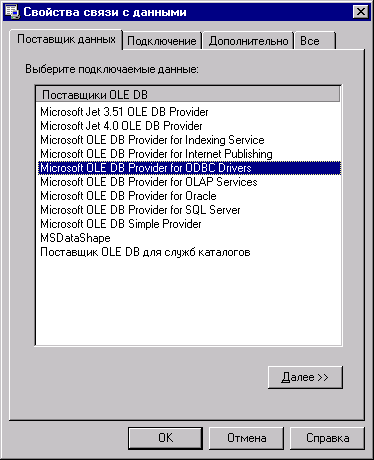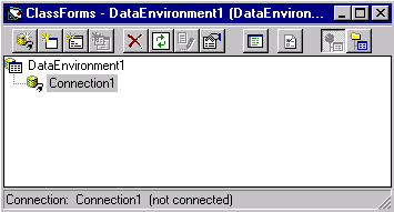 Рис. 16.9. Окно DataEnvironment 2. Для добавления нового соединения нажмите кнопку Add Connection (Добавить соединение) на панели инструментов окна DataEnvironment. В окне появится новый элемент, который по умолчанию имеет наименование Connection 1. 3. Выберите для данного элемента команду контекстного меню Properties (Свойства). Открывается диалоговое окно Свойства связи с данными, предназначенное для ввода параметров соединения с сервером. 4. На вкладке Поставщик услуг диалогового окна Свойства связи с данными (рис. 16.10) выберите из предложенного списка тип подключаемых данных. 5. Перейдите на вкладку Подключение и введите имя сервера, имя и пароль пользователя (если в этом есть необходимость), выберите из раскрывающегося списка базу данных на сервере. 6. Чтобы убедиться в правильности задания параметров соединения, нажмите кнопку Проверить подключение. Если подключение выполнено успешно, появится сообщение, что проверка подключения выполнена. 7. Завершив установку параметров, нажмите кнопку ОК для закрытия диалогового окна. Для просмотра входящих в соединение объектов откройте окно Data View. Для этого в меню View (Вид) выберите команду Data View Window (Окно просмотра данных) или нажмите одноименную кнопку на стандартной панели инструментов Visual Basic.