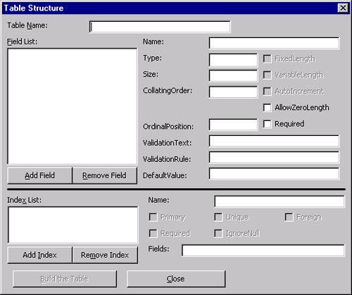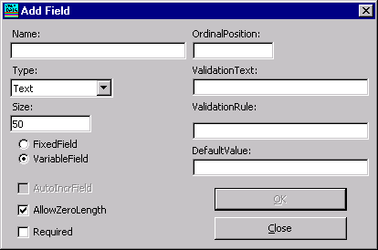 Рис. 16.4. Диалоговое окно Add Field, предназначенное для создания полей 4. В поле Name (Имя) введите наименование поля. Наименование каждого из полей таблицы, как правило, выбирается произвольно, но таким образом, чтобы отразить характер информации, которая будет храниться в данном поле. 5. Тип поля определяется типом данных, хранящихся в этом поле. Используя раскрывающийся список Type (Тип) диалогового окна Add Field, укажите тип поля. 6. С помощью полей ValidationText и ValidationRule можно задать текст сообщения, выводимого при неправильном вводе данных в это поле, и условие правильности ввода данных. 7. Используя поле DefaultValue (Значение по умолчанию), можно задать значение, вводимое в поле по умолчанию при добавлении в таблицу новой записи. 8. Завершив ввод информации, касающейся текущего поля, нажмите кнопку ОК. Созданное поле будет добавлено в таблицу, а поля диалогового окна Add Field будут подготовлены для ввода следующего поля. 9. Повторяя пункты с 4 по 8, введите все поля таблицы. 10. Завершив ввод всех полей таблицы, нажмите кнопку Close для закрытия диалогового окна Add Field. Вы возвращаетесь в диалоговое окно Table Structure. Список Field List (Список полей) содержит поля таблицы. При выборе из этого списка наименования поля, в полях, расположенных справа от списка, отображаются параметры текущего поля, введенные в диалоговом окне Add Field. 11. Для создания индекса таблицы нажмите кнопку Add Index (Добавить индекс). Открывается диалоговое окно Add Index (рис. 16.5), содержащее в названии наименование таблицы, для которой создается индекс.