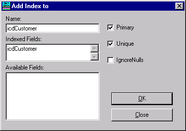 Рис. 16.5. Диалоговое окно, предназначенное для создания индекса таблицы 12. В поле Name диалогового окна введите наименование индекса. 13. Для указания полей, входящих в индекс, используется список Available Fields (Доступные поля). Дважды щелкая мышью на наименовании поля в этом списке, перенесите в поле Indexed Fields (Поля индекса) поля, образующие индекс.