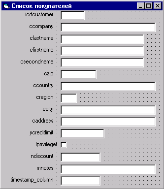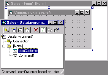 назад | содержание | вперед Размещение полей объекта Command в форме Объект command удобно использовать при создании форм, предназначенных для просмотра и редактирования данных. Для создания формы редактирования списка покупателей выполните следующие действия: 1. Создайте в окружении данных новый объект Command. Выберите активное соединение для команды. 2. Настройте объект command таким образом, чтобы он выбирал данные из отдельной таблицы. В нашем случае это будет таблица Customer (Список покупателей). 3. Откройте форму проекта, в которой будете размещать поля объекта Command. 4. Для размещения в форме полей необходимо выбрать объект Command в окружении данных (рис. 17.19), нажать левую кнопку мыши и, удерживая ее в нажатом состоянии, перенести в форму. После чего отпустить кнопку мыши.