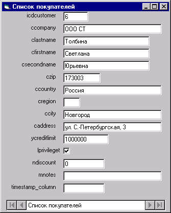 назад | содержание | вперед Использование элемента ADO Data Control для перемещения по данным В форме, созданной с использованием объекта Command и представленной на рис. 17.21, отсутствуют объекты управления перемещением по записям таблицы. Для управления передвижением курсора по записям таблицы подходит элемент управления ADO Data Control. Для добавления этого элемента в созданную нами с помощью объекта command форму выполните следующие действия: 1. Разместите в форме элемент управления ADO Data Control. 2. Для того чтобы связать элемент ADO Data control с результирующим множеством, полученным с помощью объекта command, добавьте в код обработки события Form_Activate для формы следующую строку кода: Set adoCustomer.Recordset = deSales.rscomCustomer 3. После этого сохраните форму и запустите ее на выполнение. Результат представлен на рис. 17.22.