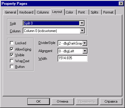 назад | содержание | вперед Вкладка Layout Вкладка Layout (Расположение) (рис. 17.31) используется для настройки внешнего вида столбцов каждого из разделов. Раскрывающийся список Split содержит все доступные для данного элемента DaraGrid разделы, а список Column — столбцы, входящие в текущий раздел. Для разных разделов, а также столбцов можно определить свой внешний вид с помощью флажков и полей, расположенных на вкладке.