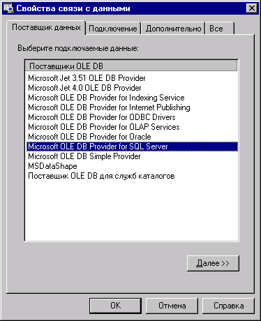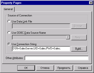 Рис. 17.3. Диалоговое окно для настройки строки соединения с источником данных Если вы хотите настроить соединение с источником данных с помощью файла Data Link, то вам необходимо выбрать опцию Use Data Link File и с помощью кнопки Browse выбрать в диалоговом окне Open нужный файл. Для соединения с источником данных с помощью ODBC установите опцию Use ODBC Data Source Name и в раскрывающемся списке выберите требуемый источник данных ODBC. Если в списке отсутствует источник данных, который вы хотели бы использовать, то нажмите кнопку New для вызова мастера настройки нового источника данных ODBC. Третий способ настройки соединения с источником данных подразумевает непосредственный ввод строки соединения. Для использования строки соединения с источником данных выберите опцию Use Connection String и введите вручную текст строки в расположенное под опцией поле. Для формирования строки соединения служит диалоговое окно Data Link Properties (Свойства связи с данными) (рис. 17.4), которое открывается при нажатии на кнопку Build, расположенную справа от поля ввода. Диалоговое окно Data Link Properties содержит четыре вкладки. На вкладке Privider (Поставщик услуг) в списке OLE DB Privider(s) (Поставщики OLE DB) вам необходимо выбрать поставщика услуг данных. Для продолжения настройки нажмите кнопку Next (Далее) или выберите вкладку Connection (Подключение) (рис. 17.5), на которой вы можете настроить соединение.