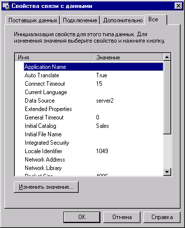 В области Other (Другое) вкладки Advanced размещены дополнительные параметры настройки соединения. Поле ввода Connect timeout (Время ожидания соединения) устанавливает промежуток времени, через который после начала соединения попытка соединения прекращается. С помощью списка Access permissions (Права доступа) можно установить ограничения для работы с данными. На вкладке All (Все) (рис. 17.7) диалогового окна Data Link Properties предоставляется возможность изменять все свойства, которые допустимы для выбранного поставщика данных.