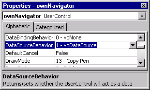 Рис. 17.37. Определение свойства DataSourceBehavior Теперь необходимо определить действия, выполняемые при инициализации объекта и при его уничтожении: Private Sub OserControl Initialize() OpenRecordset DataMembers.Add "Main" End Sub Private Sub UserControl_Terminate() DataMembers.Clear CloseRecordset End Sub В данном примере мы осуществляем доступ к одному объекту Recordset. Если их несколько в одном объекте-источнике, осуществлять выбор нужного позволит деление на несколько разделов DataMember. Для успешной работы этого механизма следует описать обработку события Get DataMember объекта userControl, которое происходит при попытке внешних объектов запросить содержимое раздела. Это событие передает параметр DataMember, где в виде строки задан требуемый раздел DataMember. Следует возвратить внешним объектам ссылку на соответствующий объект Recordset (или другой подобный источник) путем присвоения значения параметру Data данного события. В нашем случае это выглядит следующим образом: Private Sub UserControl GetDataMember(DataMember As String, Data As Object) If DataMember = "Main" Then Set Data = mrstMain Else MsgBox "DataMember " & DataMember & " не найден" End If End Sub