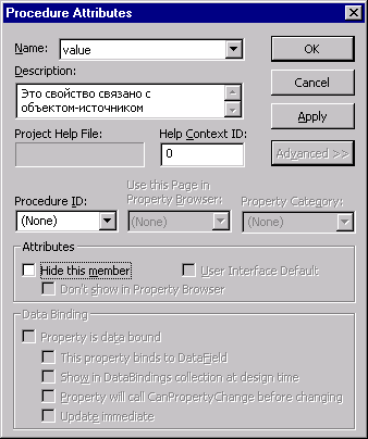назад | содержание | вперед Связывание с объектом-источником Наш компонент уже почти готов. Осталось добавить для него возможность связываться с объектом-источником. Для этого необходимо создать свойство компонента ownSlider, которое будет определять параметры связи с базой данных. Для этого в меню Tools (Сервис) выберите команду Procedure Attributes (Атрибуты процедуры). Откроется диалоговое окно Procedure Attributes (рис. 17.41). Из списка Name выберите свойство value, так как именно его мы собираемся связать с объектом-источником. Нажмите кнопку Advanced, чтобы получить возможность производить дополнительные настройки. Установите флажки Property is data bound, This property binds to DataField и Update immediate. В поле Desctiption введите описание свойства. Оно будет появляться в нижней части окна Properties.