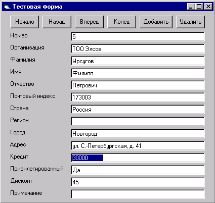 Рис. 17.41. Диалоговое окно Procedure Attributes Теперь удалите из формы тестового проекта компонент Text 11 и добавьте вместо него новый компонент ownsiiderl. Вы увидите, что у нашего компонента тоже появились свойства DataSourse, DataMember И DataField. Для свойства DataSource выберите значение ownNavigatorl, для свойства DataMember — значение Main, а для DataField — Creuitlimit. Запустите приложение. Теперь вы можете видеть созданный компонент в действии (рис. 17.43). Однако, если вы попробуете изменить значение компонента с помощью клавиш-стрелок, вас ждет разочарование. Значения будут меняться, но не будут заноситься в базу данных. Чтобы проверить это, перейдите к следующей строке и вернитесь назад. Все дело в том, что мы не сообщили объекту-источнику, что значение, хранимое нашим объектом ownsiider, было изменено пользователем и отличается от того значения, что получено из базы данных, а следовательно, имеется необходимость в корректировке записи. Чтобы устранить этот недостаток, измените код события KeyDown так, как показано ниже: Private Sub UserControl_KeyDown(KeyCode As Integer, Shift As Integer) Select Case KeyCode Case vbKeyLeft Value = Value — Step Extender.DataChanged = True Case vbKeyRight Value = Value + Step Extender.DataChanged = True End Select End Sub Здесь мы в объекте Extender, относящемся к ownslider, устанавливаем признак того, что данные были изменены. Объект-источник опрашивает Extender и получает необходимую информацию. Теперь, если вы запустите приложение, то убедитесь, что все в полном порядке.