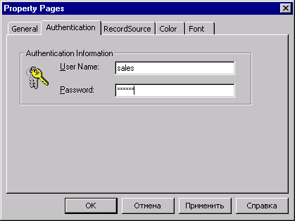 назад | содержание | вперед Определение источника записей После того как для элемента управления ADO Data control было настроено соединение с источником данных, можно приступить к определению источника записей. Для этого в диалоговом окне Property Pages элемента управления ADO Data Control перейдите сначала на вкладку Authentication (рис. 17.8), и введите имя пользователя и пароль для активизации соединения с источником данных.