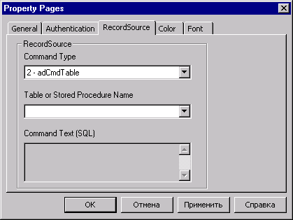 Рис. 17.8. Вкладка Authentication диалогового окна Property Pages Затем можно непосредственно перейти к настройке источника записей, воспользовавшись вкладкой RecordSource (Источник записи) (рис. 17.9) диалогового окна Property Pages. Параметры настройки данной вкладки описаны в табл. 17.4. Таблица 17.4. Параметры настройки вкладки RecordSource