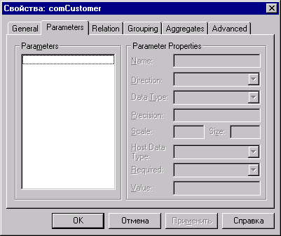 назад | содержание | вперед Вкладка Parameters Вторая вкладка диалогового окна Свойства имеет название Parameters (Параметры) (рис. 17.14) и используется для задания параметров выбранной команды. В области Parameters вкладки расположен список всех параметров. В правой части вкладки Parameters расположена область Parameters Properties, содержащая поля для определения хранимых процедур. Назначение этих полей описано в табл. 17.6. Таблица 17.6. Параметры хранимой процедуры
