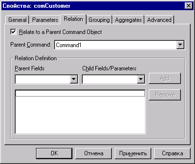 назад | содержание | вперед Вкладка Relation На вкладке Relation (Связь) (рис. 17.15) предоставляется возможность для установления соединения с родительским объектом command. Для создания соединения необходимо установить флажок Relate to a Parent Command Object (Связь с родительским объектом command), расположенный в верхней части вкладки. Раскрывающийся список Parent Command предназначен для выбора вышестоящего объекта command, с которым связывается текущий объект. В области Relation Definition (Определение связи) расположены параметры для настройки соединения. Для добавления нового соединения выполните следующие действия: 1. Из раскрывающегося списка Parent Fields выберите поле вышестоящего Объекта Command. 2. Из списка Child Fields/Parameters выберите поле текущего объекта command. 3. Нажмите кнопку Add. Новое соединение добавляется в список, располагающийся в нижней части вкладки. Если вам необходимо удалить соединение, то для этого выберите соединение и нажмите кнопку Remove.