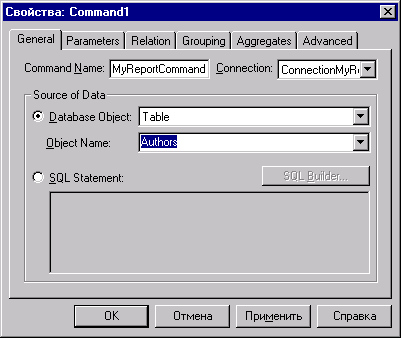 Рис. 18.9. Окно настройки источника данных отчета 6. После создания источника можно установить связь отчета с источником данных С ПОМОЩЬЮ СВОЙСТВ отчета DataSource И DataMember. В свойстве DataSource выберите значение DataEnvironmentMy Report, в свойстве DataMember — значение MyReportCommand. Теперь можно приступить к проектированию формы отчета. Начнем с заголовка отчета, то есть будем работать с разделом Report Header. В отчет будут выведены следующие поля таблицы Customer: код клиента, предприятие, фамилия представителя клиента, страна, город. В заголовке отчета необходимо расположить заголовок самого отчета и заголовки столбцов отчета. 7. Чтобы создать заголовок отчета, выполните следующие действия: