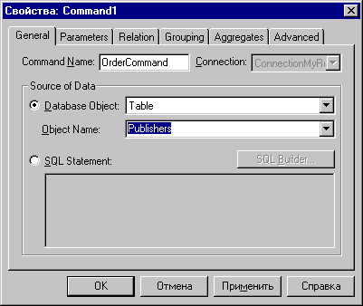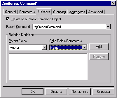 назад | содержание | вперед Создание источника данных отчета Перед проектированием отчета необходимо создать источник данных следующим образом: 1. Добавьте в окно проектирования окружения данных отчета новый источник данных. Для этого установите курсор на объект connectionMyReport и выберите команду Add Command контекстного меню. Переименуйте новый объект в CustomerCommand с помощью команды Rename (Переименовать) контекстного меню. 2. Создайте дочерний объект для customerconimand, выбрав команду Add Child Command контекстного меню. 3. Откройте окно свойств созданного объекта (рис. 18.13). 4. На вкладке General (Основные) этого окна в поле Command Name (Наименование) введите имя объекта OrderCommand, установите опцию Database Object (Объект базы данных), выберите из расположенного рядом списка тип объекта Table (Таблица), после чего из списка Object Name (Наименование объекта) выберите таблицу базы данных OrdSalem. 5. Для настройки связи этой таблицы с родительской перейдите на вкладку Relation (Связь) (рис. 18.14). Информация во всех полях задана по умолчанию. Нажмите кнопку Add (Добавить) для создания связи между родительской и дочерней таблицами, которая появится в списке связей группы Relation Definition (Описание связи).