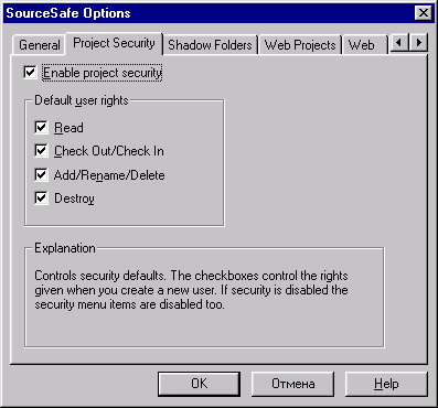 Рис. 20.3. Вкладка Project Security диалогового окна SourceSafe Options По умолчанию всем пользователям SourceSafe предоставляется полный доступ, то есть возможность выполнения всех четырех действий в базе данных. Для того чтобы можно было индивидуально назначать доступ пользователям, предназначен флажок Enable project security (Доступность защиты проекта). Если этот флажок установлен, то становятся доступны флажки назначения прав пользователей по умолчанию в области Default user rights (Права пользователей по умолчанию). В этой группе можно переназначить права доступа пользователей, предоставленные им по умолчанию при регистрации. Рекомендуется при этом устанавливать только права на чтение (R) и на блокировку/освобождение файлов при редактировании (С). При установленном флажке Enable project security становятся доступны команды меню Tools (Сервис) администратора, отвечающие за работу с правами пользователей: