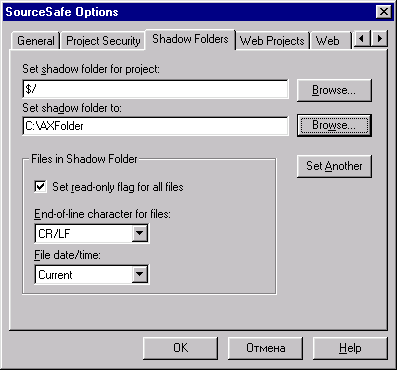 Вкладка Shadow Folders (Теневые папки) диалогового окна SourceSafe Options (рис. 20.4) задает папку "теневого" хранения файлов указанного проекта, при этом поддерживается автоматический контроль актуальности копий файлов в такой папке. При помощи "теневых" папок удобно выполнять окончательную сборку проекта.