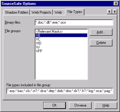 Рис. 20.5. Вкладка File Types диалогового окна SourceSafe Options