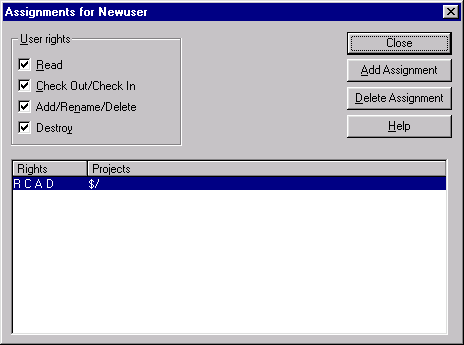 Рис. 20.9. Диалоговое окно Project Rights для настройки прав пользователей на проекты в базе данных Для настройки прав на проект следует в списке дерева проектов выбрать проект, для которого выполняется настройка прав, затем из правого списка выбрать пользователя и с помощью флажков, расположенных в области User rights (Права пользователя), установить набор необходимых прав. Права устанавливаются немедленно и отображаются в столбце Rights (Права) списка пользователей в виде буквенных сокращений. С помощью этой настройки каждому проекту можно назначить индивидуальные права доступа пользователей к файлам проекта. В данном случае при настройке прав отправной точкой является проект. Это удобно, например, при создании нового проекта или проверке прав существующего проекта, поскольку виден весь список пользователей. Однако если требуется назначить индивидуальные права одному пользователю, то придется искать этого пользователя по всем проектам, что довольно неудобно. Для второго варианта назначения прав существует диалоговое окно Assignments for (Назначение для), которое вызывается командой Rights Assignments for User (Назначение прав пользователя) в меню Tools (Сервис). Это окно показано на рис. 20.10. Назначение прав выполняется для текущего по списку пользователя, имя которого отображается в наименовании окна. В этом окне есть список прав на проекты и аналогичная предыдущей настройке группа флажков User rights (Права пользователя), в которой назначаются эти права. Права в этом списке отображаются те же, что были назначены в предыдущей настройке или установлены по умолчанию при регистрации пользователя. В этом окне можно изменить или добавить права на проекты. Для этого служат кнопки: