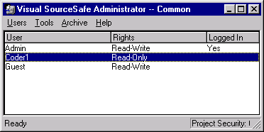 назад | содержание | вперед Работа с пользователями Основная задача при работе с пользователями — это поддержка списка пользователей и назначение прав пользователей при операциях с проектами и файлами проектов. Работа с пользователями выполняется в окне администратора Visual SourceSafe Administrator (рис. 20.6), где по умолчанию представлен список пользователей базы данных.