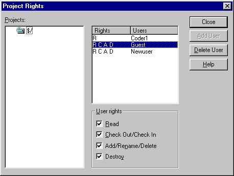 Рис. 20.6. Окно администратора SourceSafe В этом списке администратор может выполнить следующие действия с пользователями.