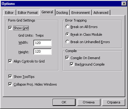 назад | содержание | вперед Линии сетки Для точного позиционирования объектов в форме удобно использовать сетку, для отображения которой на экране выполните следующие действия: 1. В меню Tools (Сервис) выберите команду Options (Параметры). 2. Перейдите на вкладку General (рис. 3.14). 3. Установите флажок Show Grid (Показывать сетку). 4. Под флажком расположено поле Grid Units, указывающее, что размер задается в твипах (twips). Размер ячейки сетки в горизонтальном и вертикальном направлениях устанавливается с помощью двух полей ввода Width (Ширина) и Height (Высота). Введите в поля числа в диапазоне от 24 до 1188 включительно. 5. Нажмите кнопку ОК для закрытия диалогового окна. При установленном в окне Options флажке Align Controls to Grid (Выровнять элементы управления по сетке) вы не можете расположить объект в произвольном месте формы. Все операции размещения объектов, их перемещения и изменения размеров будут выполняться с учетом размера ячейки сетки.