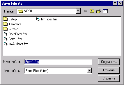Рис. 3.5. Диалоговое окно Save File As для сохранения файлов приложения 3. Так как никаких компонентов, кроме формы, новое приложение не содержит, появляется диалоговое окно Save Project As (Сохранить проект как) для сохранения самого проекта. По умолчанию в списке Папка выбрана папка, в которой сохранили форму. Введите наименование проекта и нажмите кнопку Сохранить. При последующем сохранении проекта Visual Basic по умолчанию сохраняет файлы под их именами. Если же в проект с момента последнего сохранения были добавлены новые компоненты, откроется диалоговое окно Save File As для присвоения им имен.